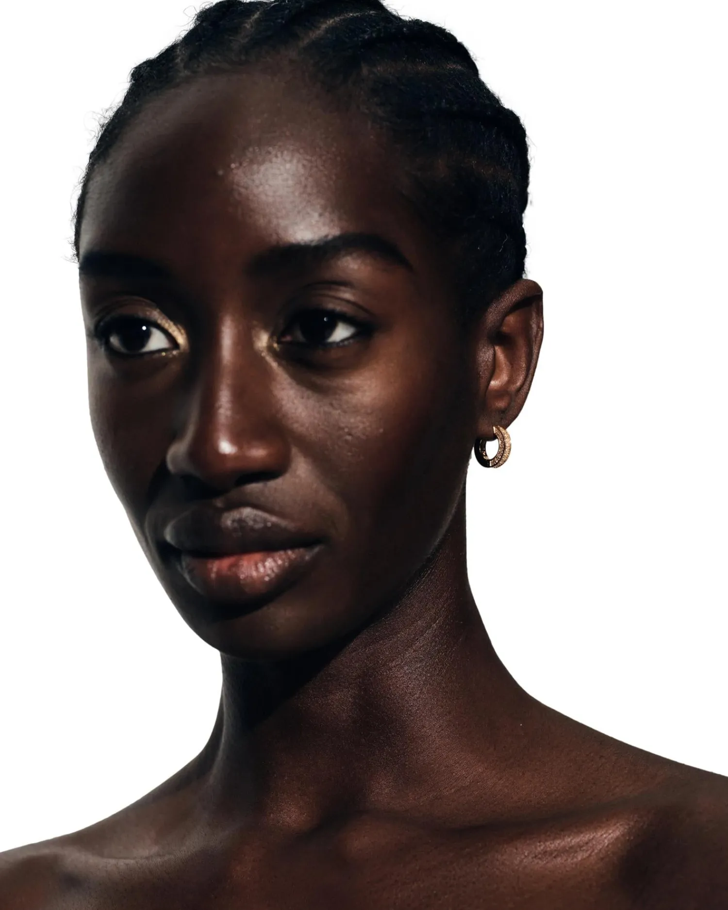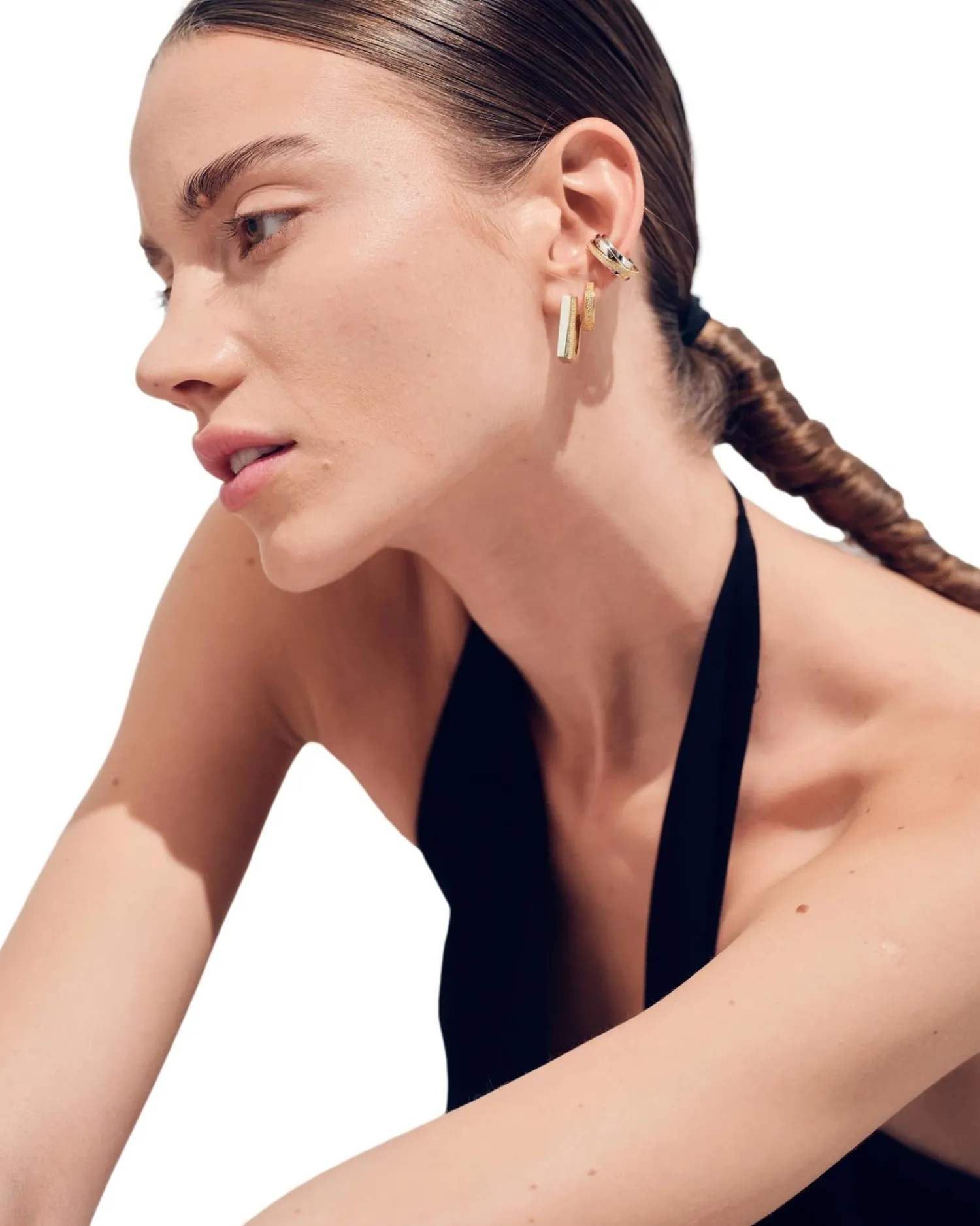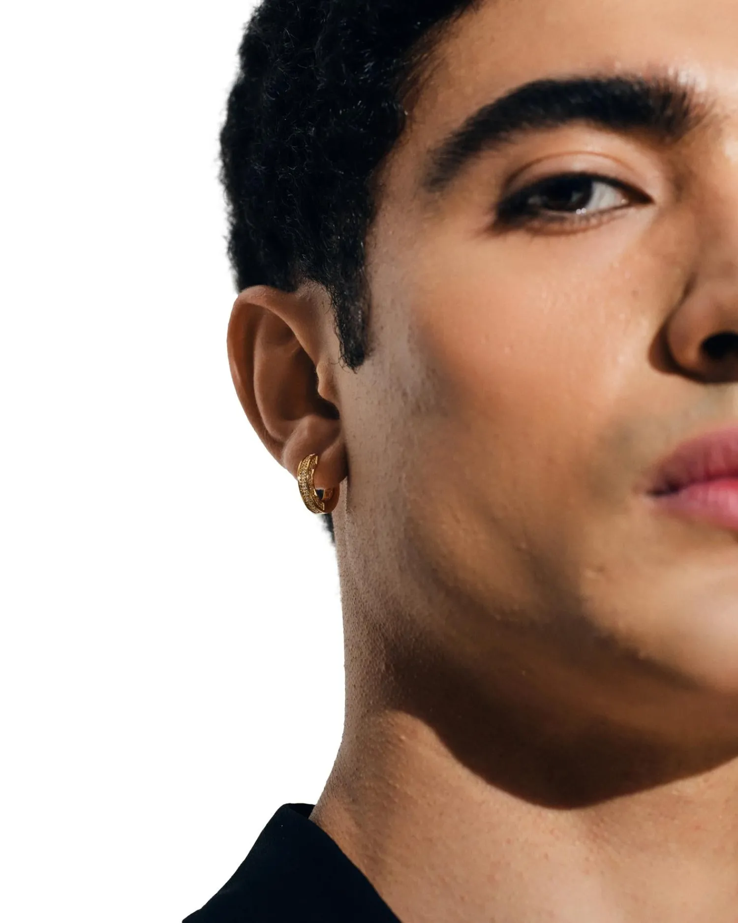 Nova Hoops Small Gold er runde gullstifter, som understreker den organiske kontrasten mellom stein og metall. Sett med hvite zirkoniumsteiner i en halv sirkel, etterlater Nova-bøylene et klassisk og lyst element til øret. Kombiner med Nova Hoops i medium for et eskalert utseende.
