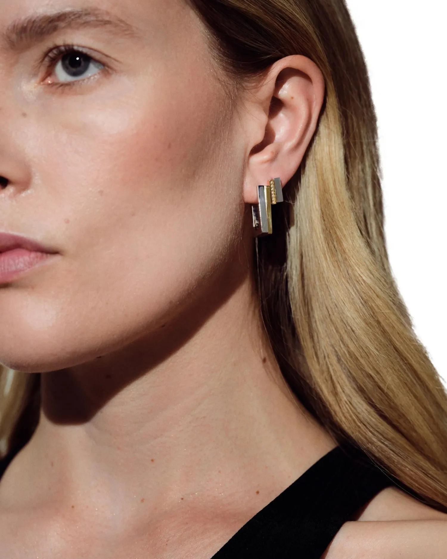 Moderne små øredobber i blanding mellom gull og sølv med små zirconia steiner.